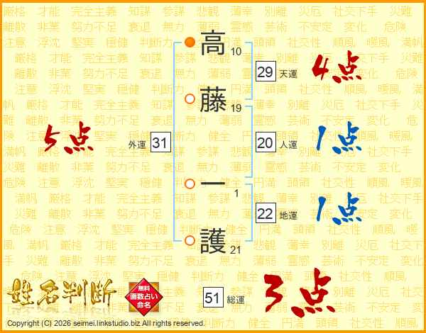 あなたの人生を表す1番重要な運勢です。生涯を通じて影響する総合運となり、主に50歳以降の晩年期に影響を及ぼします。苗字と名前の合計画数。