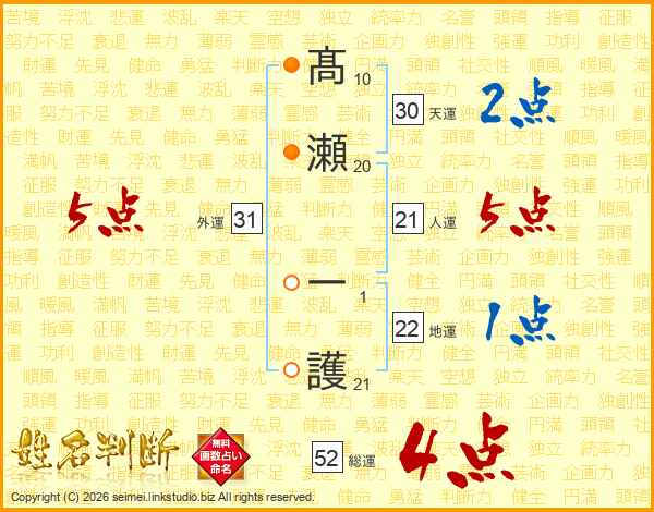 髙(10画)瀬(20画) 一(1画)護(21画)