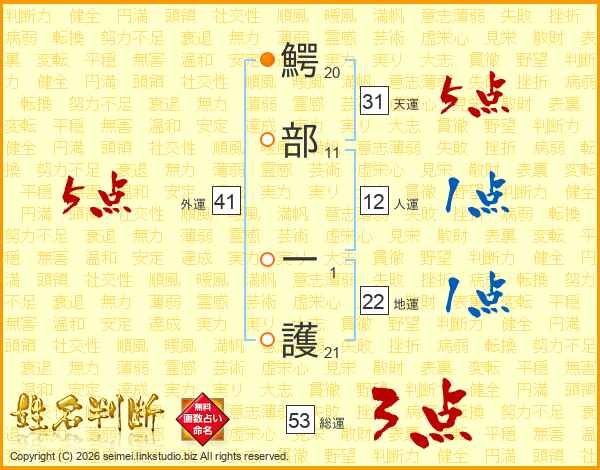 鰐部一護さんの外運は41画の5点!