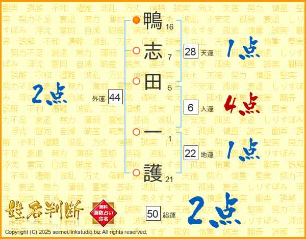 鴨(16画)志(7画)田(5画) 一(1画)護(21画)
