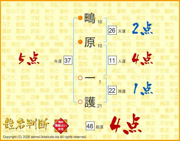 生活面を象徴する運勢です。外部から受ける影響力を表し、結婚運、家庭運や職場、環境への順応性を表します。総運から人運を引いた画数。姓や名が1文字の場合を除く。