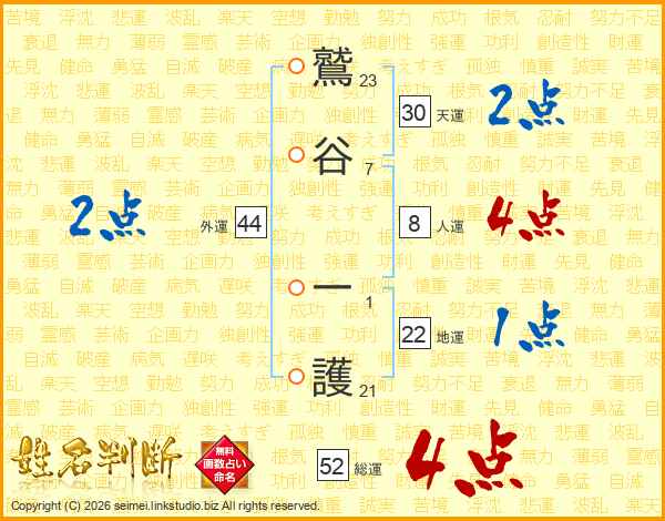 鷲(23画)谷(7画) 一(1画)護(21画)