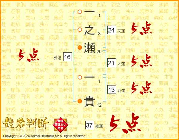 一之瀬一貴さんの総運は37画の5点!