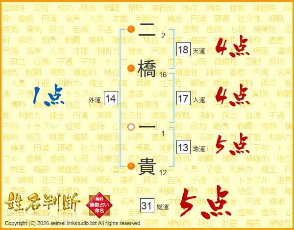 あなたの人生を表す1番重要な運勢です。生涯を通じて影響する総合運となり、主に50歳以降の晩年期に影響を及ぼします。苗字と名前の合計画数。