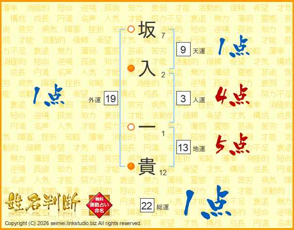 坂入一貴さんの地運は13画の5点!