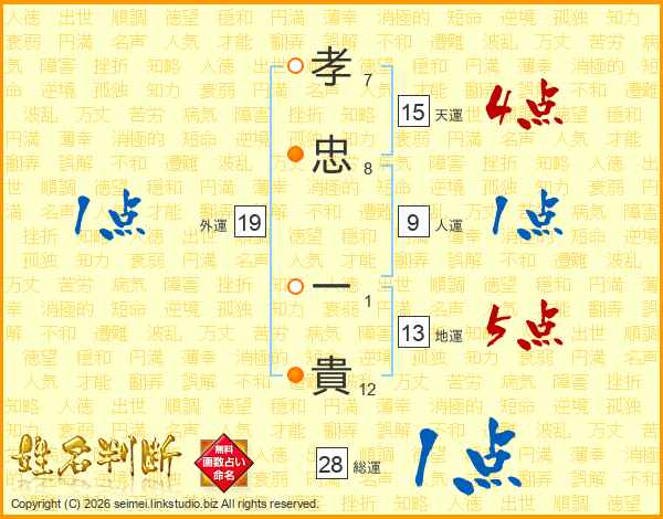 孝(7画)忠(8画) 一(1画)貴(12画)