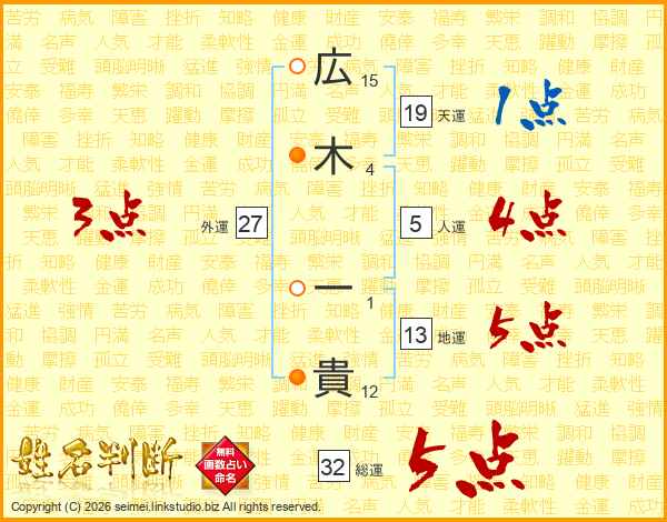 あなたの人生を表す1番重要な運勢です。生涯を通じて影響する総合運となり、主に50歳以降の晩年期に影響を及ぼします。苗字と名前の合計画数。