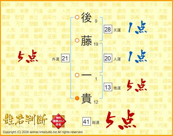 後(9画)藤(19画) 一(1画)貴(12画)