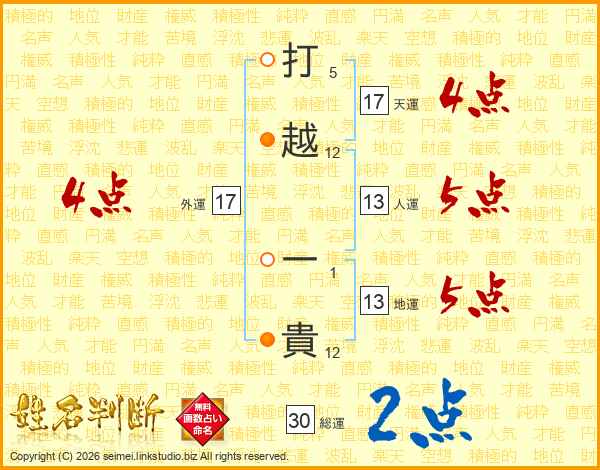 あなたの人生を表す1番重要な運勢です。生涯を通じて影響する総合運となり、主に50歳以降の晩年期に影響を及ぼします。苗字と名前の合計画数。