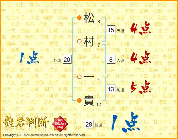 松村一貴さんの天運は15画の4点!