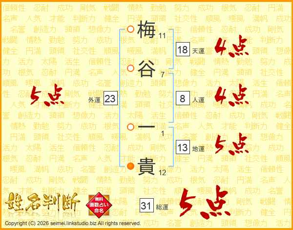 梅谷一貴さんの総運は31画の5点!