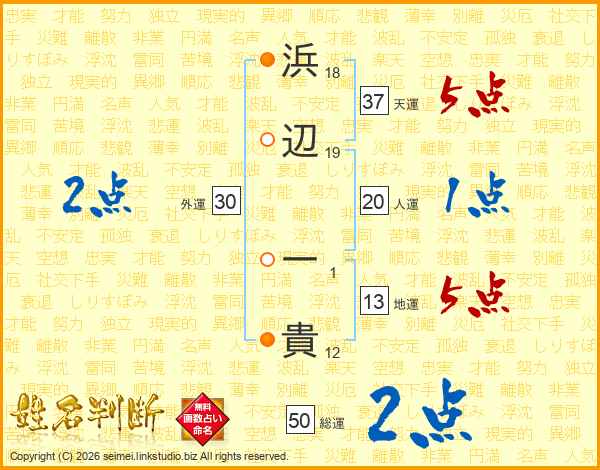 浜(18画)辺(19画) 一(1画)貴(12画)