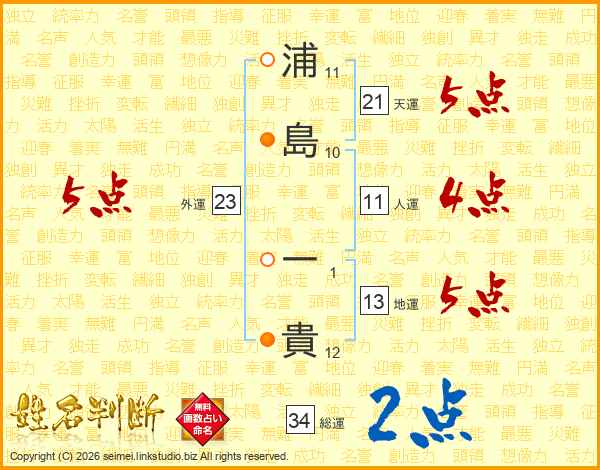 あなたの人生を表す1番重要な運勢です。生涯を通じて影響する総合運となり、主に50歳以降の晩年期に影響を及ぼします。苗字と名前の合計画数。