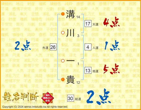生活面を象徴する運勢です。外部から受ける影響力を表し、結婚運、家庭運や職場、環境への順応性を表します。総運から人運を引いた画数。姓や名が1文字の場合を除く。