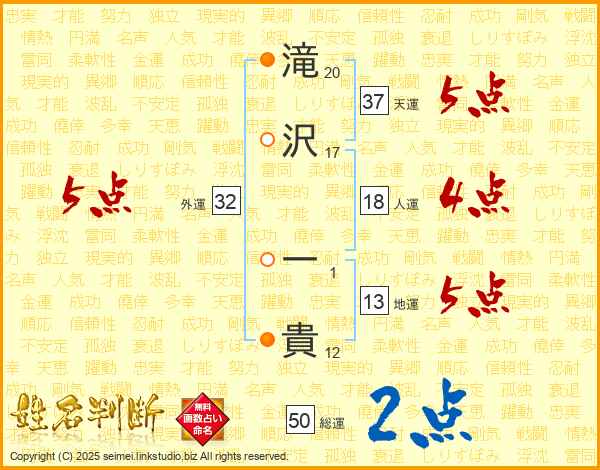 滝(20画)沢(17画) 一(1画)貴(12画)