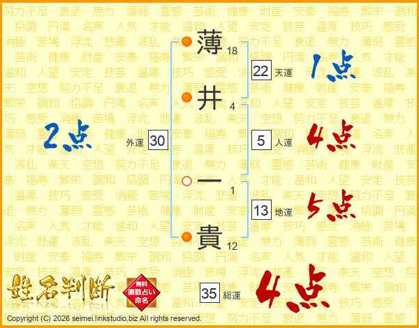 生活面を象徴する運勢です。外部から受ける影響力を表し、結婚運、家庭運や職場、環境への順応性を表します。総運から人運を引いた画数。姓や名が1文字の場合を除く。