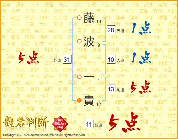 藤(19画)波(9画) 一(1画)貴(12画)