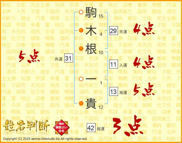 駒(15画)木(4画)根(10画) 一(1画)貴(12画)