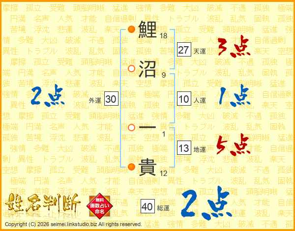 鯉(18画)沼(9画) 一(1画)貴(12画)