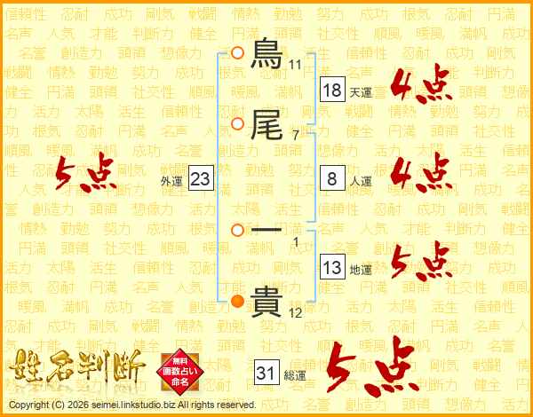 鳥(11画)尾(7画) 一(1画)貴(12画)