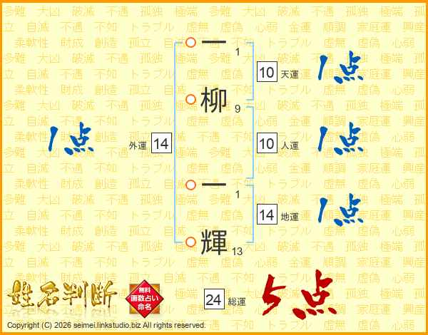 生活面を象徴する運勢です。外部から受ける影響力を表し、結婚運、家庭運や職場、環境への順応性を表します。総運から人運を引いた画数。姓や名が1文字の場合を除く。