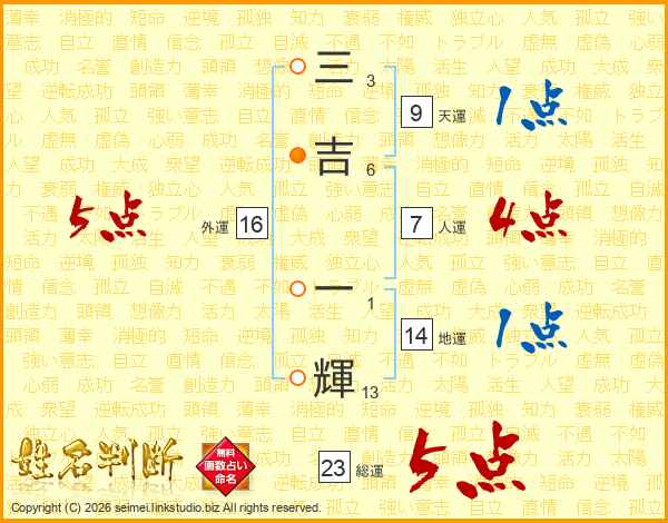 三(3画)吉(6画) 一(1画)輝(13画)