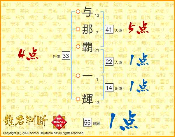 与(13画)那(7画)覇(21画) 一(1画)輝(13画)