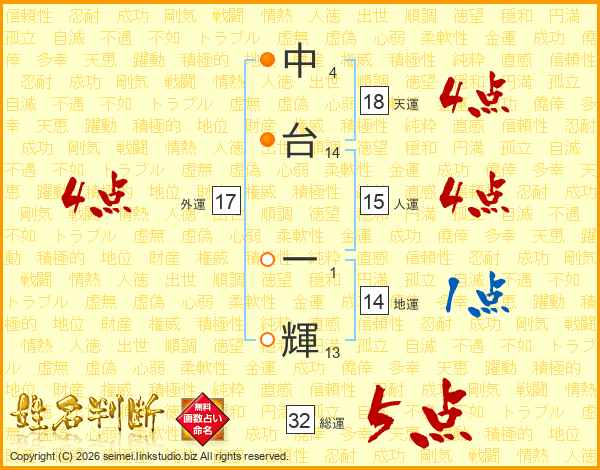 中台一輝さんの総運は32画の5点!