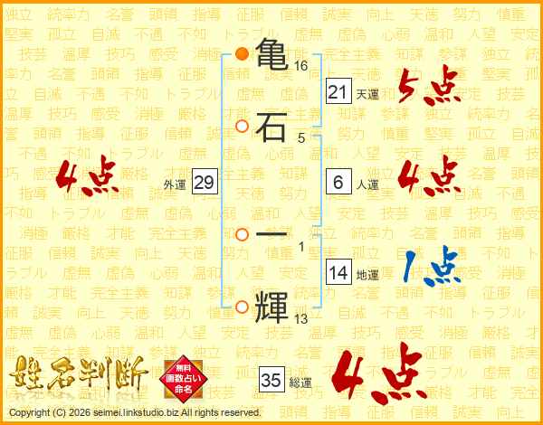 亀(16画)石(5画) 一(1画)輝(13画)
