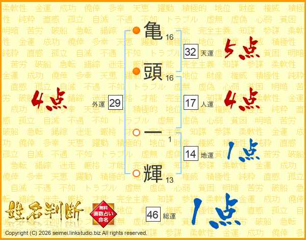 亀(16画)頭(16画) 一(1画)輝(13画)