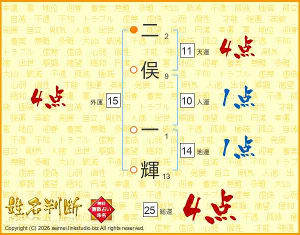 生活面を象徴する運勢です。外部から受ける影響力を表し、結婚運、家庭運や職場、環境への順応性を表します。総運から人運を引いた画数。姓や名が1文字の場合を除く。