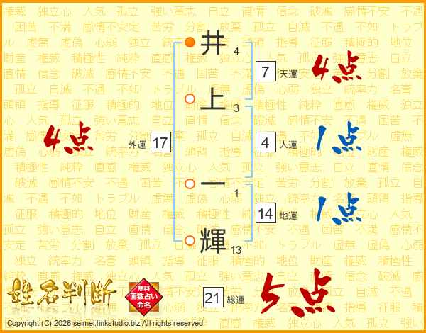 生活面を象徴する運勢です。外部から受ける影響力を表し、結婚運、家庭運や職場、環境への順応性を表します。総運から人運を引いた画数。姓や名が1文字の場合を除く。