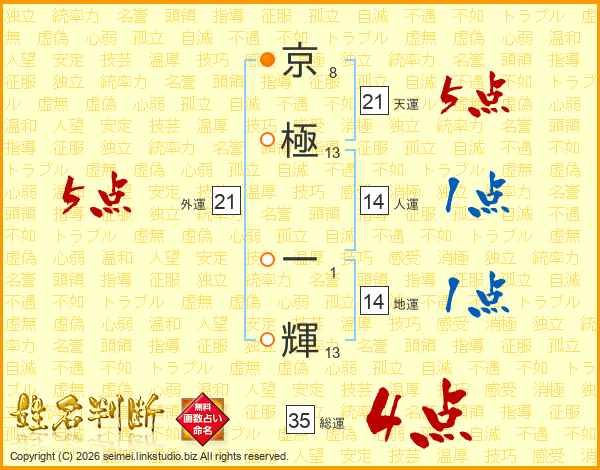 京(8画)極(13画) 一(1画)輝(13画)