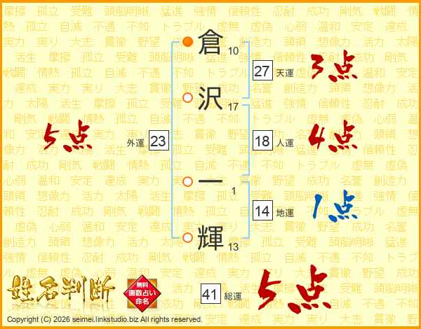 倉(10画)沢(17画) 一(1画)輝(13画)