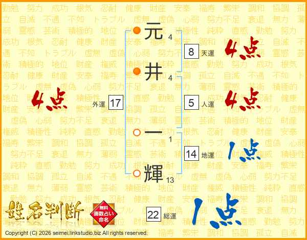 生活面を象徴する運勢です。外部から受ける影響力を表し、結婚運、家庭運や職場、環境への順応性を表します。総運から人運を引いた画数。姓や名が1文字の場合を除く。