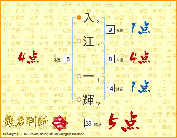 生活面を象徴する運勢です。外部から受ける影響力を表し、結婚運、家庭運や職場、環境への順応性を表します。総運から人運を引いた画数。姓や名が1文字の場合を除く。