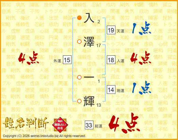 入(2画)澤(17画) 一(1画)輝(13画)