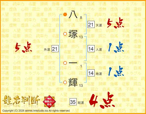 生活面を象徴する運勢です。外部から受ける影響力を表し、結婚運、家庭運や職場、環境への順応性を表します。総運から人運を引いた画数。姓や名が1文字の場合を除く。