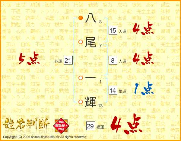 八尾一輝さんの総運は29画の4点!