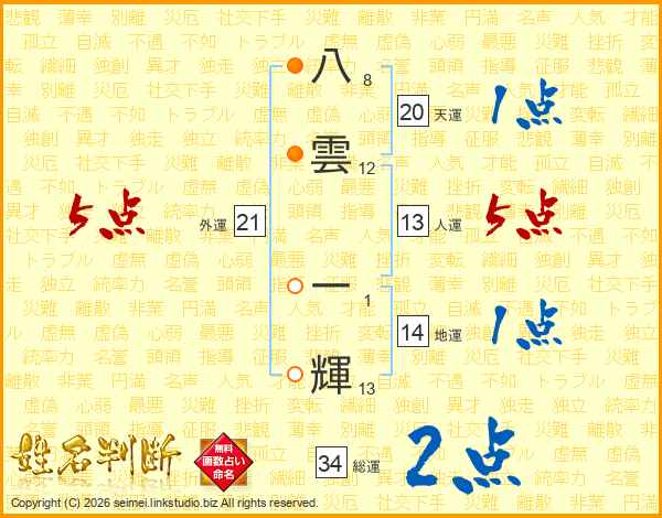 生活面を象徴する運勢です。外部から受ける影響力を表し、結婚運、家庭運や職場、環境への順応性を表します。総運から人運を引いた画数。姓や名が1文字の場合を除く。