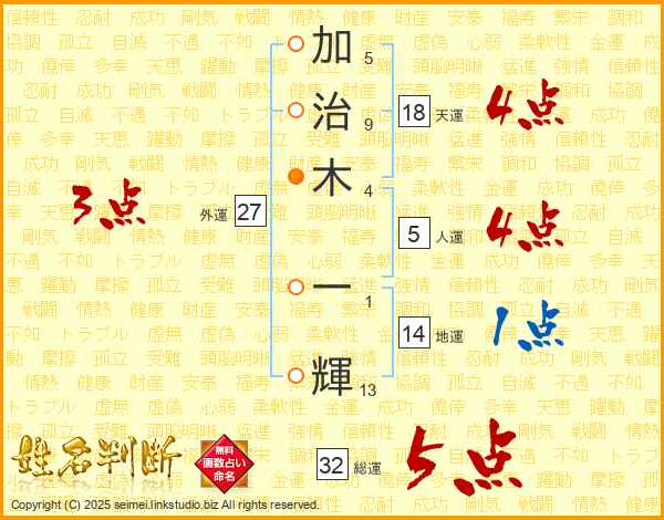 加(5画)治(9画)木(4画) 一(1画)輝(13画)