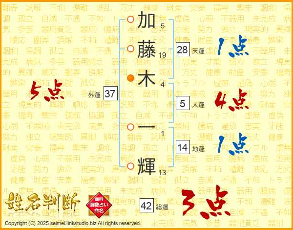 加(5画)藤(19画)木(4画) 一(1画)輝(13画)