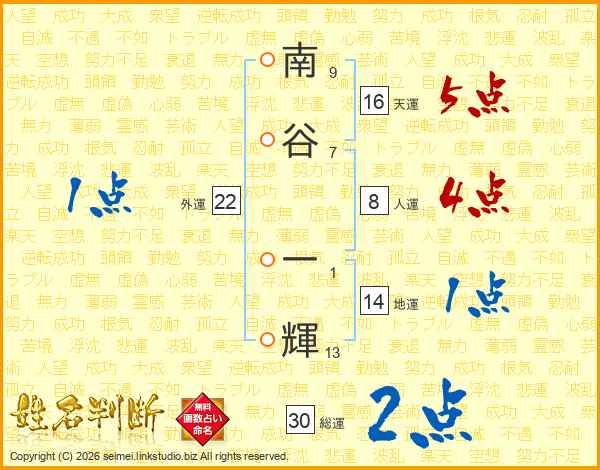 生活面を象徴する運勢です。外部から受ける影響力を表し、結婚運、家庭運や職場、環境への順応性を表します。総運から人運を引いた画数。姓や名が1文字の場合を除く。