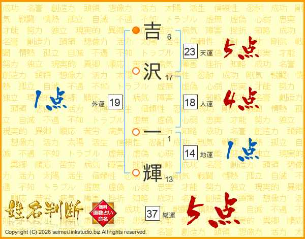 吉(6画)沢(17画) 一(1画)輝(13画)