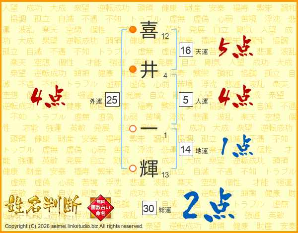 喜(12画)井(4画) 一(1画)輝(13画)