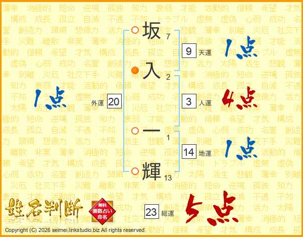 坂入一輝さんの総運は23画の5点!