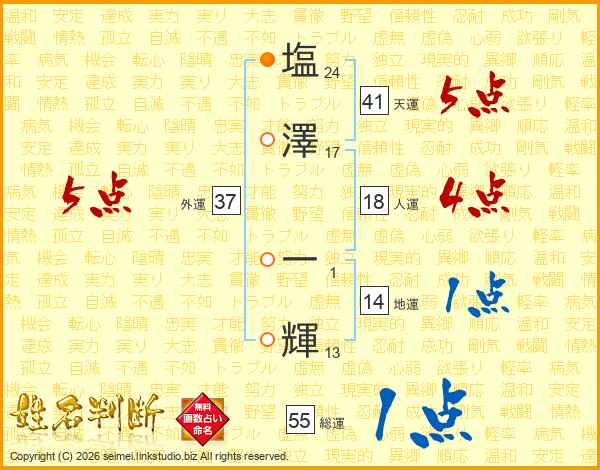 塩(24画)澤(17画) 一(1画)輝(13画)