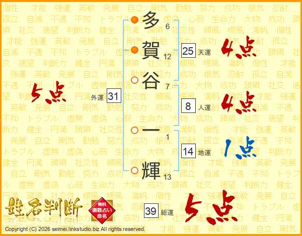 多(6画)賀(12画)谷(7画) 一(1画)輝(13画)