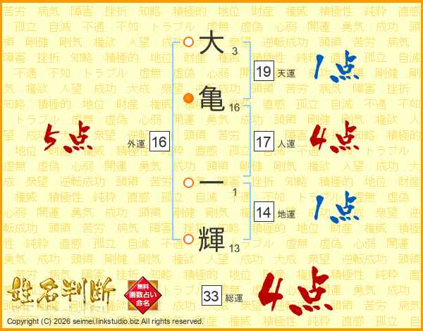 生活面を象徴する運勢です。外部から受ける影響力を表し、結婚運、家庭運や職場、環境への順応性を表します。総運から人運を引いた画数。姓や名が1文字の場合を除く。