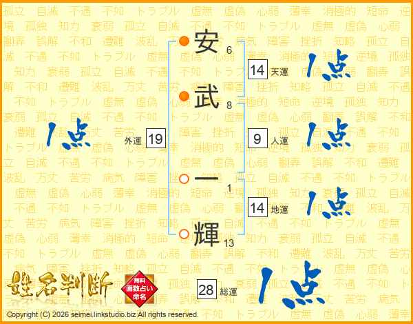 安(6画)武(8画) 一(1画)輝(13画)